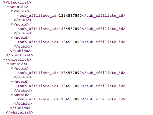 We can output sub IDs which are passed to us in the &s1 parameter to blacklist or whitelist on a per campaign basis through MotiveFeed.com in order to increase efficiency of campaign optimizations. Please speak with your account manager if you want to enable this.