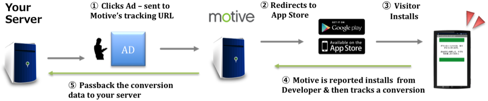 Motive acts as the tracking and attribution platform, bridging the gap between you and a third party tracking system. When an install occurs, Motive is notified of the event. We then process and attribute that install to the correct source. We record the install (conversion) to your account, and we can then optionally call your system via a server2server postback URL that you provide us. We will only call your postback URL when an install is attributed to you -- not on all install occurrences of the app.